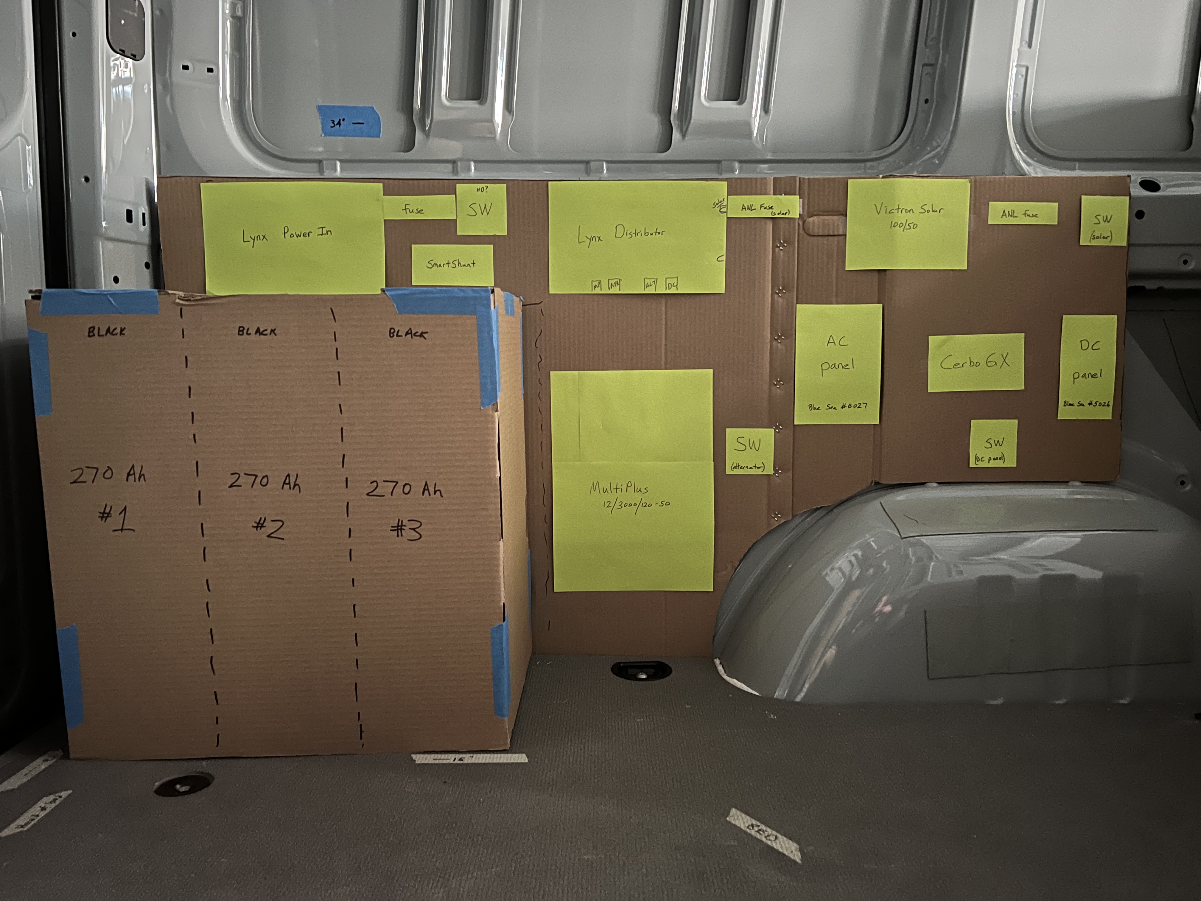 The electrical system is located in the garage, on the driver side, running from the rear to the area just above the wheel well. The electrical system is mounted on a plywood panel, currently shown as a cardboard mockup in the photo below.